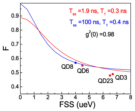 Figure 6 presents the measured polarization-resolved XX–X correlations in QDs with dominant X and XX emissions. A negative contrast in the RL/RR basis and a positive one in the HH/HV and AD/AA bases indicate the maximal entangled state |HH>+|VV> and F = (1+CHV+CDA-CRL)/4 to it: F = 0.55 in QD6 (FSS = 4.5 μeV), F = 0.48 in QD23 (6.2 μeV); both HH and HV bases show bunching, a little from spin precession in time h/FSS [3] (0.6 ns for FSS = 6 μeV) and mainly from spin flip with electrons in the barrier; a large correlation contrast remains in the AA/AD basis; in QD6 with a smaller FSS, the correlation contrast in the RR/RL basis is large (0.49), reflecting a nice restoring of X1–X2 degeneracy. QD8 and QD3 show a negative contrast in the AA/AD basis and a positive one in the RL/RR basis, reflecting F = (1 + CHV − CDA + CRL)/4 to the maximal entangled state |HH>−|VV>: F = 0.57 in QD8 (FSS = 4.1 μeV) and F = 0.49 in QD3 (FSS = 6.8 μeV), with a large contrast in the HH/HV basis (0.73 in QD8, 0.44 in QD3, in contrast to 0.21 in QD23 with nearly the same FSS as QD3) and a nearly zero contrast in the RR/RL basis since the lateral field has a large component on [1–10] to break X1–X2 wavefunction degeneracy and block spin flip between them, i.e., HH and VV cascade emissions are independent. This phenomenon is also clearly shown in QD7 in Figure 5, where the EIP (i.e., lateral field) was completely along [1–10] and the LX was nearly parallel to it for a large Stark shift, a large FSS and a large eh separation to break X1–X2 wavefunction degeneracy; like QD8, the correlation contrast in the HH/HV basis was 0.46 even for FSS = 22 μeV; the correlation contrast in the RR/RL basis was zero, reflecting independent HH and VV cascade emissions. There was no entanglement, while the robust HH/VV polarization correlations in this kind of QDs, insensitive on the FSS, can be used as photon-pair sources for quantum detection. The weak XX in QD8 was equivalent to a pulsed excitation of XX–X cascade emission to avoid XX repopulation for the highest HH bunching peak; it also showed a larger T1 ~0.4 ns. For QD3, Figure S2 in SM provides 18 combination of polarization-resolved XX–X correlations; the AA/AD and RL/RR bases show nearly zero contrast due to independent HH and VV emissions. The lh-hh mixing and EIP lead to unbalanced bunching peaks in the DA/AD or HV/VH basis. The deduced F is an optimal one excluding the unbalanced bunching and without background subtraction. Due to a finite lh-hh mixing (β ≤ 0.2), the two split lines HX and LX are nearly orthogonal linearly polarized [22,23] and can be purely filtered. Figure 7 plots these F we measured and the theoretical (F, FSS) curves (i.e., Equation 1 presented below, where f is the fidelity, gHV’ the fraction of photons uninfluenced by spin scattering, x and k the proportion of light exclusively emitted by the QD defined by T1, Tss and g2(0) given in the inset) [2,3]. QD6, QD3 and QD23 with T1 ~0.3 ns showed a reduced F from spin flip compared to the fitting curve with Tss = 1.9 ns; QD8 with T1 ~0.4 ns and weak XX (i.e., few electrons in the barrier for spin flip) showed a higher F, 0.57, little varied from the fitting curve prediction with Tss = 100 ns, reflecting little spin flip or spin scattering. A higher electric field to deplete these electrons as QDs in Figure 3 with AlGaAs barrier as capping [18,25,26,27] to reduce tunneling and a sub-bandgap optical excitation is desirable.