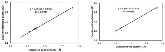 The compounds 1 and 2 optimized geometries are presented in Figure 6. It can be evinced from this figure that the calculated geometric features of both structures match very well their counter parts experimentally determined, using X-ray diffraction data. The calculated and optimized bond distances are in good agreement with each other (Table S1). Good correlations were also determined to exist between the experimental and the calculated bond distances for the 1 and 2 structures (Figure 7). Indeed, the correlation coefficients values are very close to unity, and the maximum absolute errors do not exceed 0.04 Å and 3.8° for bond distances and bond angles, respectively.