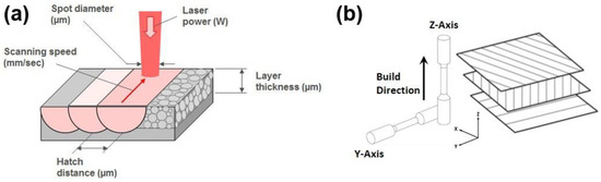 Main parameters and axes in SLM process: (a) parameters denoted in one layer and (b) axes, build direction, and scan pattern strategy used for layers in SLM samples.