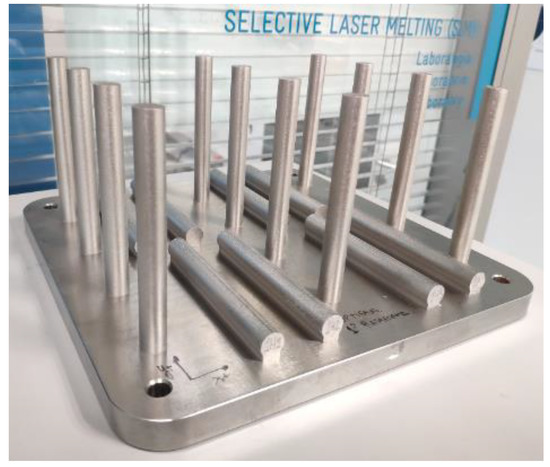 View of cylindrical samples obtained from SLM process. “Z-axis” samples (left, center and on the right of the platform) and “Y-axis” samples (interspersed with vertical specimens).