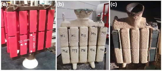 View of the mould and block samples obtained from investment casting process in IN718. (a) Mould in wax, (b) mould with shell after cast, and (c) mould without shell with integrated casts.