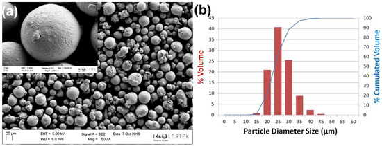 IN718 pre-alloyed powder. (a) Morphology of the particles in SEM image (20 kV) and (b) granulometry and distribution analysis.