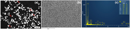 Internal porosity in the cross-section of powder particles was also evaluated. The results of the porosity measurements show a low percentage of internal porosity: 0.10 ± 0.12%, which results in a particles densification of 99.9 ± 0.12%. This is positive, since according to various authors [18,19,20,21], the internal porosity of pre-alloyed nickel-based powders is revealed later, after rapid solidification, as gas trapped in SLM-manufactured parts. Since a lower internal porosity of the particles translates to a greater apparent density (without considering the morphology of the powder and its influence on the packing of the particles during the measurement of apparent density), a starting powder with the lowest internal porosity possible is desirable to minimize the presence of pores after solidification in laser melting. The results obtained from internal porosity are also related to the measured apparent density (4.18 ± 0.01 g/cc3) with the method defined in the ISO 3923-1 standard and using the Hall flowmeter funnel. In Figure 5, images of internal porosity analysis (Figure 5a) as well as EDS microanalysis with the chemical composition of particles analyzed for this powder (Figure 5b), which confirms the composition of IN718 alloy (AMS 5383F), can be observed.