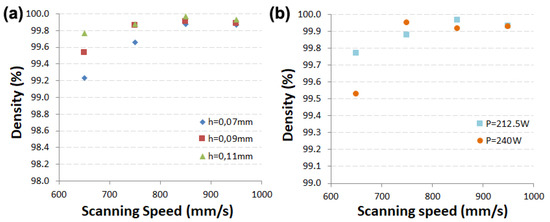 Evolution of material density as a function of scanning speeds for different hatch distance and laser power. (a) Material density for 212.5 W, and (b) density evolution using 0.11 mm hatch distance.
