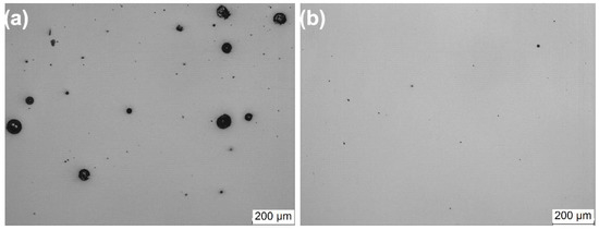 Micrographs of the cross-section of SLM cuboids with different process parameters. (a) power: 240 W, speed: 650 mm/s, and hatch distance of 0.09 mm. (b) power: 212.5 W, speed: 850 mm/s, and hatch distance of 0.11 mm.