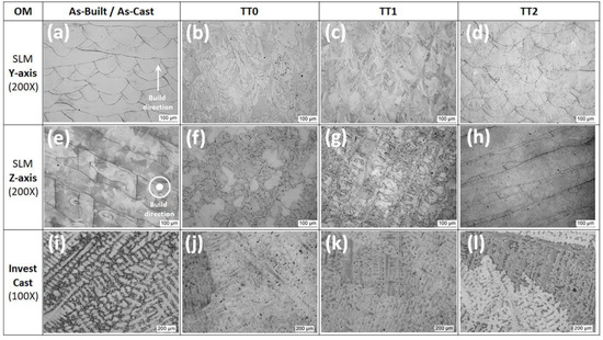 Optical micrographs for IN718 in as-built/as-cast and heat-treated condition. (a–d) SLM samples in Y-axis, (e–h) SLM samples in Z-axis, and (i–l) Investment casting samples. (SLM samples are etched with Kalling Nº2 and investment casting samples only polished).