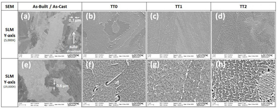 The microstructure of the samples manufactured in both orientations is similar with the only difference in the orientation of the grains and the re-melted and thermally affected areas; therefore, FESEM images are shown only on the Y axis (Figure 9). The microstructure of these specimens is characterized by a very thin cell structure, with a dendrite arm spacing of less than 1 µm and a fine precipitation in the grain borders (See Figure 9a,e). These precipitates are rich in Niobium. According to Deng et al. [27] and Popovich et al. [28], they are Laves precipitates. The formation and precipitation of Laves phase reduces the Niobium content available for the constitution of γ′ and γ″ precipitates [11,16,26,27], so it is important to control their formation to allow the adequate strengthening and subsequent achievable mechanical resistance in the material.