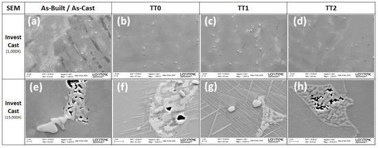 FESEM micrographs for IN718 investment casting in As-cast and heat-treated conditions. (a–d) Investment casting samples at low magnification, and (e–h) Investment casting samples at high magnification. (samples not etched, only polished).