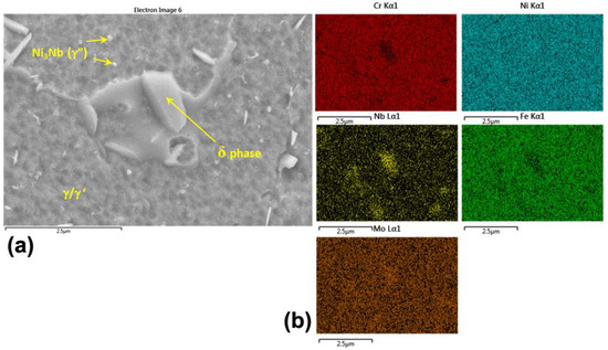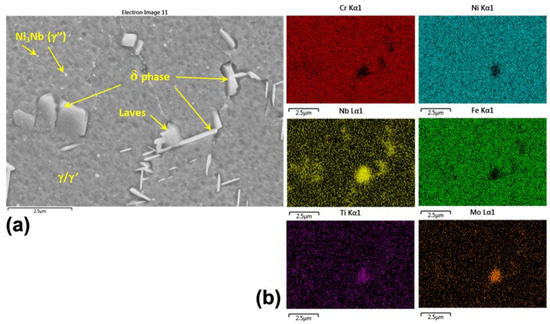 FESEM micrograph for IN718 alloy obtained by investment casting. (a) with modified heat treatment—TT1 (polished samples, SE mode), and (b) the respective X-ray elemental maps through EDS.