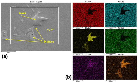 Additionally, Laves and δ phases are usually present in IN718 microstructure. The δ phase is a Ni3Nb orthorhombic phase with Nb content between 6–8% (wt.%). It is formed in the range of 650 °C to 980 °C. It is also formed from γ″ phase in overaging [2,11,12]. The Laves phases are hexagonally close-packed (Ni,Fe,Cr)2(Nb,Mo,Ti) phases with a Nb content between 10–12% (wt.%) and hexagonally close-packed structure. According to different authors, these phases are detrimental to ductility, and fatigue and creep resistance [3,11,13].
