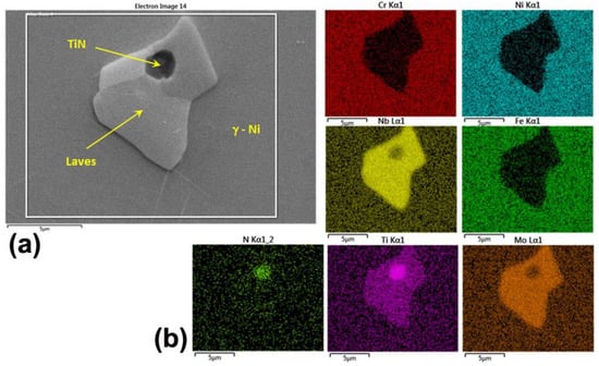 In the case of investment casting, the dissolution of the phases that were in the interdendritic regions was not achieved and the traces of dendrites but with smaller interdendritic arms compared to the as-cast sample were observed. Laves phases of greater size than those observed after the application of the standard treatment, appeared; in addition, titanium nitrides were observed together with these phases, as shown in Figure 14.