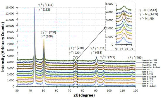 To study the crystallographic phase’s presence in the as-built/as-cast conditions and their evolution with the heat treatments, a XRD analysis was performed. Figure 15 shows the diffraction pattern obtained for the different conditions. In the pre-alloyed powder used for the SLM process, the principal phases are gamma and/or gamma prime: γ-Ni(Fe,Cr) and/or γ′-Ni3(Al,Ti). Similar phases are detected both in SLM and investment casting samples, since γ/γ′/γ″ have similar crystallography according to the peak intensity for each phase. Phase detection in XRD technique has limits: Only crystallites larger than 10 nm are detected [35] and it usually fails to recognize phases present at less than 5% of mass fraction in the specimen. The existence of γ″ is not well detected in the XRD pattern due the overlapping of their peaks with γ/γ′. There are no evident peaks for delta and Laves phases, perhaps due to their low volumetric fraction in the alloys obtained with both manufacturing processes, but strong <111> and <200> diffraction peaks for γ/γ′are observed in all the conditions studied, and it is consistent with XRD patterns reported for IN718 SLMed samples by some authors [25,30,32,36].