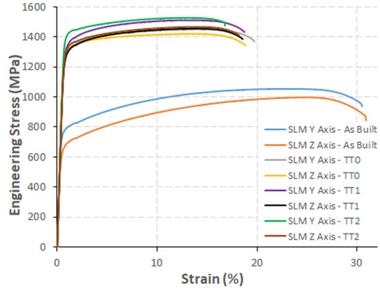 Engineering stress–strain curves for SLM samples in different conditions.