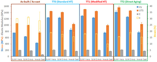 When comparing the mechanical properties obtained between the heat-treated SLM and investment casting samples, it can be observed that the SLM samples exceed the mechanical resistance obtained in the investment casting samples with standard heat treatment, and adequate ductility is also obtained in all the conditions studied. Comparing the best results obtained in SLM (Y Axis—TT2) with the best results obtained for investment casting samples (TT0), there is a 51.3% increase in maximum resistance, with a 66.2% higher yield strength and also a slight increase in the elongation at break of 0.5%. These results indicate that the expected hardening was achieved through the strengthening mechanisms by precipitation and dispersion of particles (solid solution), which are sought with the combination of putting into solution and artificial aging in the standard TT0, taking into account that both IN718 alloys have similar chemical composition in both manufacturing routes studied. This can be seen graphically in the comparison between all the conditions and processes shown in Figure 17, where yield strength (σy), ultimate tensile strength (UTS), elastic modulus (E), and the percentage of elongation at break (ε) are represented.