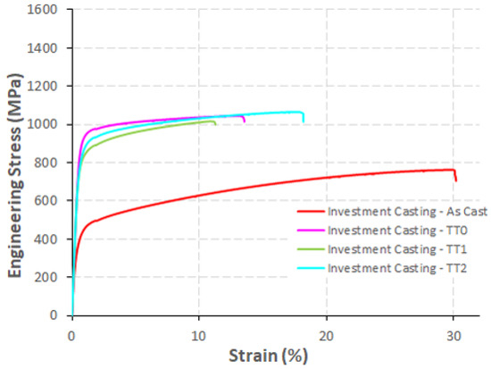 Engineering stress–strain curves for investment casting samples in different conditions.