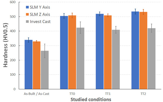 When comparing the values obtained for the different conditions, a similar trend to that seen in the evaluation of mechanical properties with the tensile tests is observed. The bar graph in Figure 19 shows the comparison between the IN718 samples obtained by SLM and the investment casting samples. Comparing samples in the same heat treatment stage, it can be concluded that in all cases, SLM samples achieve higher hardness values than investment casting ones. The SLM samples with TT2 present approximately 26.3% more hardness than the investment casting samples with TT0, which confirms that the hardening by dispersion of γ′/γ″ particles (solid solution) in the γ nickel matrix allows to slightly improve the mechanical properties after its SLM processing, applying only stepped direct aging.