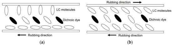 By using the structure in which the dye molecules decline to the substrate plane, the incident light propagating along the dye molecules passes through the molecules with little absorption, and the light moving perpendicular to the molecular axis is absorbed more effectively. Two types of LCDs possess this structure. The first is the hybrid aligned nematic (HAN) and the other is the high pretilt angle LCDs. High pretilt angle LCDs are defined by alignment layers showing a high pretilt angle, and the directions of LC molecular declination on both substrates are opposite. The structures of these types of LCDs are shown in