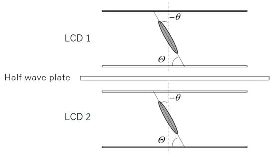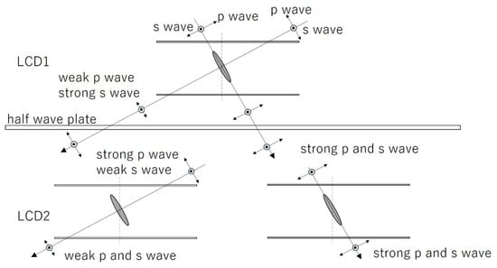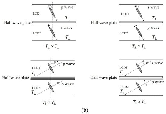 In contrast, the s-wave transmittance for LCD1 is T⊥ and changes to a p-wave by a half-wave plate. The p-wave transmittance through LCD2 is represented by Equation (3). Consequently, the transmittance of the incident light from Θ can be expressed by Equation (3).