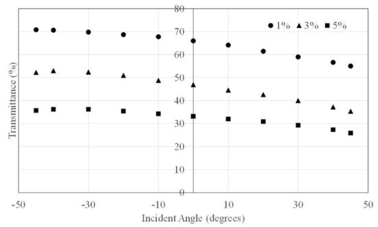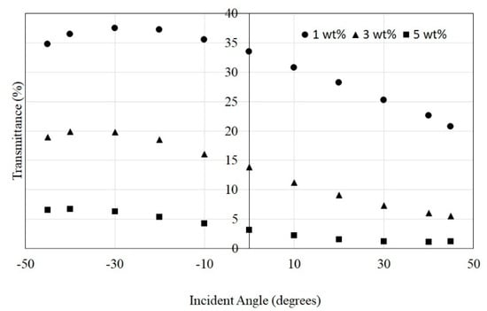 Figure 6 shows the transmittance dependence on the incident angles for HAN-LCDs using LC materials containing 1, 3, and 5 wt.% of the dichroic dye NKX-4173 (Hayashibara Ltd., Japan). In the case of 1 wt.%, the maximum value, minimum value, and ratio between them was 71%, 55%, and 1.3 respectively, in the range of ±45°.