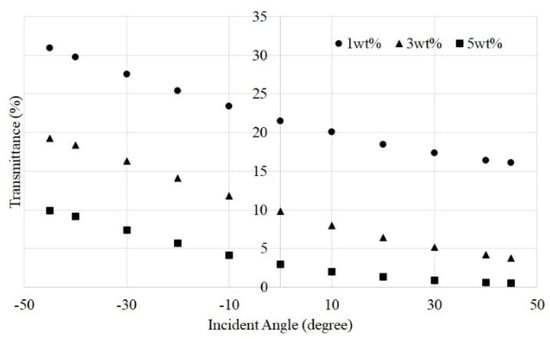 Figure 4, using LC materials containing 1, 3, and 5 wt.% of the dichroic dye NKX-4173 (Hayashibara Ltd., Japan). In the case of 1 wt.%, the maximum value, minimum value, and ratio was 37%, 21%, and 1.8, respectively, in the range of ±45°.