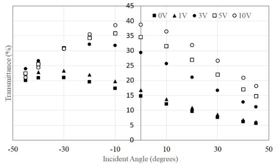 Figure 10 shows the transmittance dependencies on the incident angle for two-layer HAN-LCDs using LC materials containing 3 wt.% of dichroic dye with applied voltages of 0, 1, 3, 5, and 10 V. The same voltage was applied to the two LC panels during the measurements. By applying a voltage, the polar angle of the LC molecules increased, resulting in the asymmetric properties of the LCDs decreasing. The saturated voltage of LCDs, using the LC material ZLI-4792, was approximately 4 V. However, the asymmetric properties were still observed at applied voltages as high as 10 V because of the effect of the pretilt angle and the LC molecular arrangement maintained in the vicinity of homogeneous alignment layer.