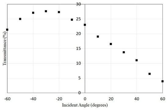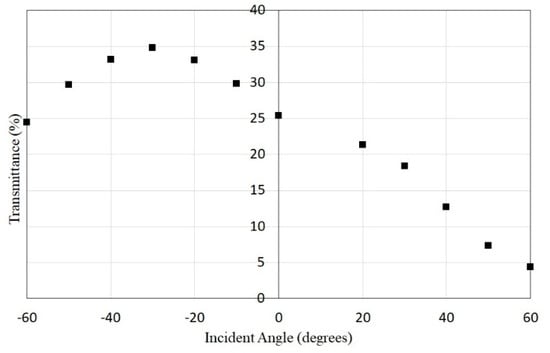 Figure 9, only the p-wave was used by a polarizer. By increasing the incident angle at (−) direction, the transmittance increases monotonically. However, in