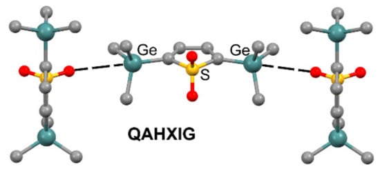 Two examples of X-ray structures exhibiting directional Ge···O and Ge···F TtBs are highlighted in Figure 3 and Figure 4. The first one is propagated along a direction of the crystal, thus forming infinite 1D supramolecular chains through highly directional TtBs (QAHXIG) [72], where the most polarized covalent bond (O2SC–Ge) interacts with the sulfonyl oxygen atom of the adjacent molecule. This interaction possesses a Ge···O distance of 3.520 Å and C–Ge···O angle of 179.8°, in line with the strong linearity expected for TtBs.