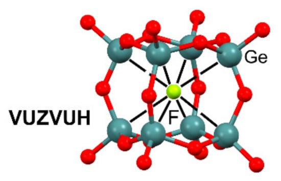 In Figure 4, the X-ray structure of [Ge8O12(OH)8F]– cluster (VUZVUH) [70] is represented in which the Ge8O12(OH)8 fragment presents a cuboidal structure, with the fluoride anion encapsulated in the center, establishing eight directional TtBs (see Table 2), where the F is situated opposite to the Ge–O bonds. As previously demonstrated [20], in this type of cubanes, the eight σ–holes merge in the center of the cube, generating a macro σ–hole in which only small anions fit inside.