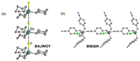 In the case of Tin, two X-ray examples have been selected and characterized by the formation of infinite 1D supramolecular chains in the solid state. In both structures, the LP-donor atom interacts with the Sn atom opposite to the most polarized bond, Sn–F in BAJWOY [74] and Sn–Cl in BIBQIN [75] (see Table 2 for distances and angles). In the latter structure, the tetrel atom of the chlorotris(4-cyanobenzyl)tin molecule undergoes a very short Sn···N TtB, especially considering that the sp-hybridized N atom of the cyano group is a poor electron donor. Similar behavior is observed in tricyclohexyltin fluoride (BAJWOY, Figure 5a), where a short TtB is established between a fluorine atom of one molecule and the Sn σ–hole from the covalent Sn–F bond of an adjacent molecule, thus propagating the infinite chains despite the poor Lewis basicity of the F atom. Therefore, the quite short TtBs are likely due to the strong σ–hole donor ability of Sn, in good agreement with the MEP surface shown in Figure 2.