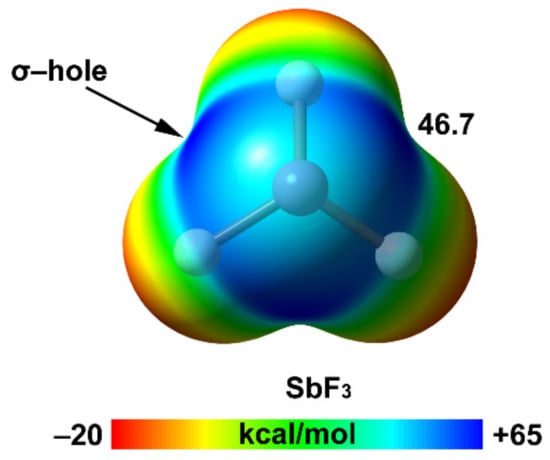 Figure 6 shows the MEP surfaces of SbF3 as an illustrative example of the pnictogen series. As can be observed, the SbF3 molecule presents a wide region of positive potential where the global maximum is located approximately opposite to the Sb–F bonds. Hence, it is expected that PnBs involving the heavier Pn atoms present a lesser directionality compared to TtBs. As also observed for the SbF3 molecule, the large and negative MEP values at the F atoms reveal that the Sb–F bonds are strongly polarized. Finally, it is also worth noting that the MEP values at the σ–holes are greater for tetrel atoms than for pnictogen ones (see Table 1 and Table 3), in agreement with the atomic polarizabilities.