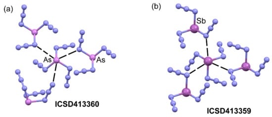 Ball-and-stick representation of ICSD413360 (a) and ICSD413359 (b) structures exhibiting PnBs, which are represented using dashed lines.