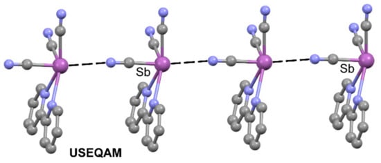 In the case of USEQAM [100] structure, the tricyano-antimony(III) is co-crystallized with 2,2′-bipyridine (Figure 9) and exhibits two very short PnBs between the N atoms of bipyridine and Sb (2.724 and 2.560 Å). The third PnB is significantly longer, and it involves the N atom of the cyano group of the adjacent molecule. The quite different PnBs distances observed in this compound agree well with the relative basicity of the N-donor atoms. This combination of PnBs regulates the formation of infinite 1D supramolecular assemblies in the solid state. In general, the angles observed for the PnBs gathered in Table 4 are less directional than those described for tetrel bonding interactions (see Table 3). This result is in agreement with the MEP surface plots shown in Figure 2 and Figure 6 that point to larger and more accessible σ–holes in SbF3 than in SnF4.