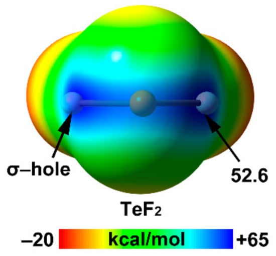 Figure 10 shows the MEP surfaces of TeF2 as an illustrative example of the whole series. As is evident, TeF2 exhibits an extended region of positive MEP values in the molecular plane with two σ–holes located approximately on the extension of the F–Te bonds, thus anticipating worse directionality for the heavier chalcogen atoms. Similar behavior is observed in pnictogen fluorides (see Figure 6). Contrariwise, all tetrel elements (from C to Sn) present well-defined σ–hole regions (see Figure 2 for SnF4 representation) and form highly directional interactions.
