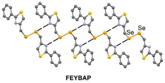 Selenium is a critical trace element [102,103] with an increasing number of investigations [104,105,106]. Its derivatives are considered of great importance in the pharmaceutical industry, and several review articles [9,40,41] are available in the literature devoted to the study of organoselenium compounds and their interactions with electron-rich species. Particularly, many studies demonstrate the ability of organic diselenides to establish both intermolecular and intramolecular ChBs with electron-rich atoms, which are stronger and more directional (see Table 6 for geometrical details) in the prolongation of the Se–Se bond [9]. Two examples are shown in Figure 11 and Figure 12, the first one illustrating ChBs in the prolongation of the diselenide bond (FEYBAP [107]).