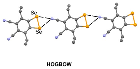 Two recent examples of directional and structure guiding ChBs in selenodiazoles are represented in Figure 13. The SAJPAY and SAJQED [109] structures correspond to the cocrystals of 3,4-dicyano-1,2,5-selenodiazole with p-methoxypyridine-N-oxide and p-phenylpyridine-N-oxide, respectively. Both structures present the same binding pattern, thus showing double ChB interactions in the cocrystals forming four-membered supramolecular rings (Figure 13a,b).