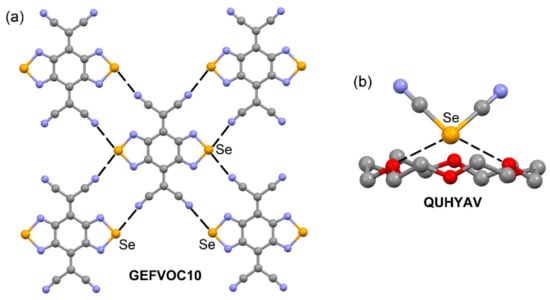 To further showcase the importance of Se as a σ–hole donor, the X-ray structure of 2,2′-(benzo[1,2-c:4,5-c′]bis([1,2,5]selenadiazole)-4,8-diylidene)dimalononitrile (GEFVOC10 [110]) is given in Figure 14a. It presents a planar geometry, and the Se atoms behave as double ChB donors toward the N atoms of the adjacent cyano groups with a noticeable directionality (169.5°, see Table 6). These short ChBs involve a molecule with its four nearest neighbors (Figure 14a), driving the formation of infinite 2D supramolecular assemblies. In addition, the cocrystal of 18-crown-6 with selenium dicyanide (QUHYAV [108]) is represented in Figure 14b. It shows two short and moderately directional ChBs (geometric details in Table 6) that are established opposite to both electron-withdrawing cyano groups, therefore confirming the σ–hole nature of the interaction.