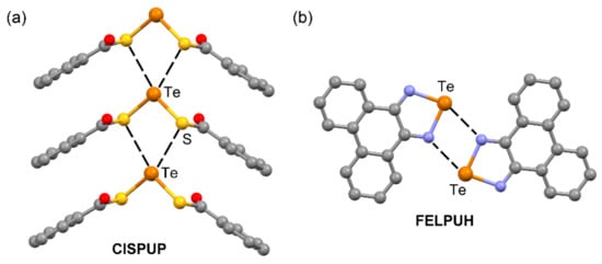 Figure 15 shows two selected examples of ChBs involving Te. In the first one (CISPUP [117]), a head-to-tail arrangement is formed in the solid-state structure of bis(thiobenzoato-S)-tellurium, where each Te atom is involved in double ChBs with the S atoms of the adjacent molecule, thus generating an infinite 1D supramolecular column (Figure 15a). In the second one, phenanthro(9,10-c)-1,2,5-telluradiazole (FELPUH [118]) self-assembles, forming dimers in the crystal packing through two short and symmetrically equivalent Te···N ChBs (Figure 15b). The directionality of the ChBs is in general moderate in the two structures represented in Figure 15 (see Table 6). This fact is in agreement with the MEP surface of TeF2 that shows extended and deep σ–holes, thus allowing larger rearrangements and readjustments of the geometries in these molecules owing to the influence of secondary interactions and packing effects without a significant weakening of the ChB.