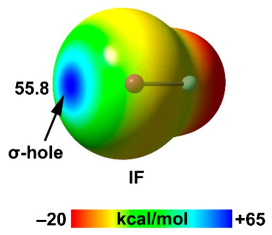 Figure 16 shows the MEP surface of IF as an illustrative example of the whole series. As can be observed, the σ–hole is small and well-defined opposite to the I–F bond, thus predicting stronger directionality in HaB, in comparison to ChB or PnB and similar to TtBs that also showed well-defined σ–hole regions (see Figure 2).