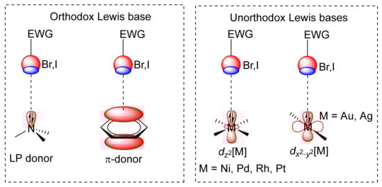 HaBs involving bromine and iodine as σ–hole donors have been used in a wide variety of fields, including crystal engineering, catalysis, supramolecular chemistry, molecular recognition of anions, and membrane transport [28,29,30,31,32,33,34,35,36,37,38,39,47,48,49,50,51]. Therefore, this section is devoted to discussing more unconventional and recent investigations on halogen bonding in which the Lewis base is a transition metal complex. That is the dz2[M] orbital in a square planar or the dx2–y2 [M] in a linear two coordinated complex act as electron donor instead of a more conventional Lewis base (see Figure 17).