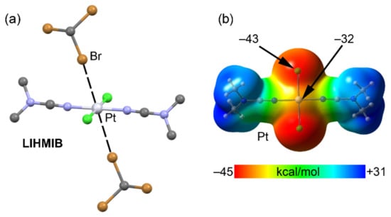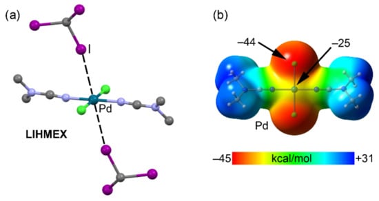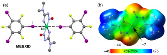 The ability of Ni(II) square planar complexes to form cocrystals with iodine derivatives has been studied in terms of donor–acceptor interactions [119,120]. Figure 18a shows the X-ray structure of a nitroguanidate Ni(II) complex (MEBXID [117]) that undergoes two simultaneous Ni···I HaBs with the co-crystallized 1,3,5-triiodotrifluorobenzene (FIB). The distance is significantly shorter than the sum of van der Waals radii (Ni + I = 3.61 Å) and the C–I···Ni angle is far from linearity (142.5°, see Table 8) but even farther from the ideal orientation expected for a semi-coordination bond (~90°). The MEP surface plot (see Figure 18b) shows that the MEP is negative over the central Ni atom and that the minimum is found in the molecular plane between the N and O atoms of the nitroguanidate group. The value of MEP at the Ni indicates that this interaction has a predominant HaB nature that is further supported by a recent investigation, which has proven that the σ–hole at the I atom in FIB embraces a large region and is able to be involved in HaBs with C–I···:A angles up to 105° [121].