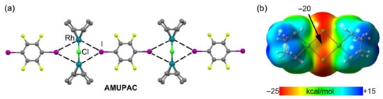 A Rh(I) complex of formula [RhCl2(COD)]2 (COD = 1,5-cyclooctadiene) has been recently synthesized and X-ray characterized to form co-crystals with several σ–hole iodine donors [122]. X-ray diffraction studies, in combination with extensive computations, indicate that the dz2-orbitals of two positively charged Rh(I) centers provide sufficient nucleophilicity to form three-center HaB with the σ–hole donors. The two metal centers function as an integrated HaB acceptor, providing assembly via metal-involving halogen bonding (see AMUPAC structure in Figure 19a). In this X-ray structure of [RhCl2(COD)]2·(C6F4I2), two iodine σ–hole donors interact with the Rh2Cl2 core of the complex above and below the Rh2Cl2 plane. The MEP surface represented in Figure 19b confirms the nucleophilicity of the Rh2Cl2 cores (−20 and −13 kcal/mol). This unprecedented double HaB interaction is responsible for the propagation of the 1D-chain ···[Rh2Cl2]···I(C6F4)I···[Rh2Cl2]··· shown in Figure 19a.