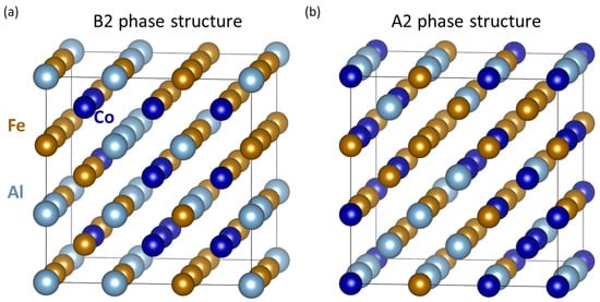 When modeling a partially disordered B2 phase (with two compositionally different sublattices) and a single-sublattice disordered A2 phase of FeCoAl, we have utilized two different 54-atom supercells, see Figure 1a,b, respectively. The atoms on the two B2-phase sublattices and one A2-phase sublattice were distributed according to the special quasi-random structure (SQS) concept [] as generated by the USPEX software [,,]. The actual stoichiometry of our supercells, FeCoAl or FeCoAl, slightly deviates from the exact FeCoAl stoichiometry as 54 is not divisible by 4. The cube-shaped 54-atom supercells, 3 × 3 × 3 multiples of a 2-atom B2 cell, are convenient for modeling of elasticity of disordered systems. Single-crystal elastic constants were determined using the stress-strain method []. It should be mentioned that our computational supercells, that are used as models for partly-disordered B2 and disordered A2 phase of FeCoAl, do not have their anisotropic elastic properties equal along crystallographic directions that would be equivalent in the case of cubic-symmetry systems, such as along the [100], [010] and [001] directions. The computed differences are small (a few percent), nevertheless, we have used a proper mathematical approach [] to determine the closest cubic-symmetry elastic tensor and its , and components are reported below.
