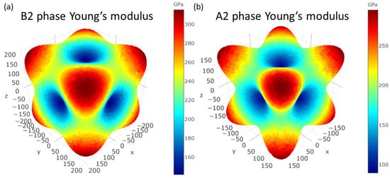 Computed directional dependences of Young’s modulus for both the B2 phase (a) and A2 phase (b) illustrating single-crystal elastic properties. Please mind different ranges of values corresponding to the same color scale.