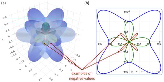 Further, we have also used the ELATE software [] (open access at http://progs.coudert.name/elate, accessed on 6 October 2021) to determine both the minimum (−0.243) and the maximum (0.857) value of single-crystal Poisson ratio . Interestingly, as our analysis predicts that the Poisson ratio of the A2-phase FeCoAl is negative for certain directions of loading, it is an auxetic material (as was also the case of the B2 phase []). Thorough information is provided in Figure 3 that visualizes a directional dependence of both maximum and minimum value of Poisson ratio and the values in the x-z plane (for details, see ref. []). The negative values of are marked by red color in Figure 3.