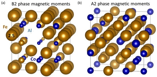 Regarding the magnetic properties, the computed local magnetic moments in both the B2 and A2 phase are shown in Figure 4. The total magnetic moment in the case of the B2 phase amounts to 68.26 per 54-atom supercell, while the A2 phase has the total magnetic moment by 18.7% higher, equal to 81.0 per 54-atom supercell. Common magneto-volumetric correlations can help us to connect this difference in the total magnetic moment with the fact that the volume of the A2 supercell (641.6 Å per 54-atom supercell) is higher than that of the B2 phase (624.3 Å per 54-atom supercell). Figure 4 also neatly visualizes the differences between the local magnetic moments in the B2 and A2 phases as an illustration of the impact of the different level of order in the B2 and A2 polymorphs.