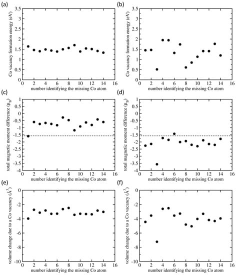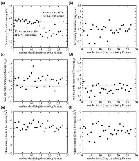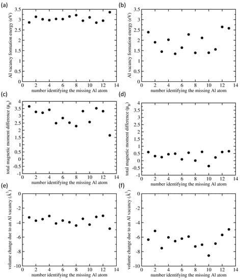 The above-discussed mechanism is polymorph-sensitive. In contrast to the results for the B2 phase, where the Al atoms are limited to only one half of all possible atomic positions (i.e., one sublattice of the two in the B2 polymorph), the Al atoms are statistically distributed over all lattice sites in the A2 phase. Consequently, the above-mentioned increase of the total magnetic moment due to Al vacancies in the B2 polymorph is less pronounced in the A2 phase and the changes of the total magnetic moment are both positive and negative covering a significantly narrower range close to the zero value, see Figure 7d. The computed changes in magnetic moments can be possibly explained in terms of charge transfer that can be analyzed using, e.g., molecular orbital calculations []. Regarding the vacancy-induced volumetric changes, see Figure 7e,f, they are qualitatively similar to those in the case of Fe and Co vacancies.