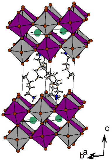 To further suppress ion migration in single crystals of Cs2AgBiBr6 and in turn increase ρ, their 3D structural dimensionality can be lowered to 2D dimensionality by incorporating n-butylammonium cations (n-butylammonium BA+ = ) to produce layered organic–inorganic (BA)2CsAgBiBr7 double perovskite single crystals with monoclinic symmetry, space group and an indirect of 2.08–2.38 eV [13,14]. The BA+ cations are bound to the and octahedra and form a barrier layer between the adjacent bilayers of perovskite network with the Cs+ cations in the A-crystallographic site (Figure 1). However, significant distortion—especially of the Ag octahedra—characterises this compound.