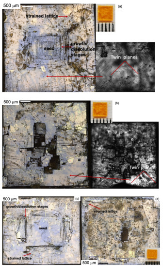 Single crystals of (BA)2CsAgBiBr7 are characterised by pseudo-rectangular crystal faces that indicate a growth orthogonal to the <001> direction in the monoclinic space group (Figure 2). The overgrowth rims surrounding the seed are distinguishable in the top crystal face of sample Exp1 (Figure 2a; image in reflected light), and they appear more uniform in the top crystal surface of sample Exp4 (Figure 2c). Those that appear dark grey to black reflect intermittent growth and dissolution stages as a consequence of a variable T gradient. The segregation lines run parallel to the crystal–solution interface and appear in variable intensity and distribution. The narrowly spaced lines surround the seed and are consistent with higher solubilities and slower growth rates at higher temperatures. The wider spaced segregation lines near the edges of the crystal developed as a consequence of lower solubilities and faster growth rates at lower temperatures. The strained lattice and twin planes are prominent in the top and bottom crystal faces of sample Exp1 (Figure 2a,b; image in transmitted light). On the {001} plane, twinning occurs during growth—under stress and strain conditions as T is reduced—due to the sharing of the lattice points on the crystal face of the seed and the overgrowth zone. At unstable crystal–solution interfaces, impurities (e.g., solvated precursor ions) are commonly incorporated into the growing crystal. They can cluster to form precipitates, especially on the bottom crystal face, which grew in contact with the bottom of a growth vessel (Figure 2d; image in reflected light). The top crystal faces are somewhat less riddled with isolated inclusions and arrays of inclusions, which appear to be circular and rectangular in shape.