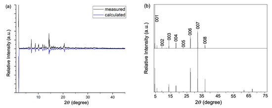 A single crystal structure investigation yielded the unit cell parameters a = 8.0742(4) Å, b = 8.0085(4) Å, c = 19.8639(1) Å and β = 101.7223(1)° (space group P21/m). Details of the crystal structure analysis are summarised in the Supplementary Materials (Table S1). The measured PXRD pattern in comparison with the calculated pattern from the single crystal structure analysis is shown in Figure 3a. Major peaks in the single crystal XRD pattern for Exp1 and Exp2 occur at 2θ angle of 4.57° corresponding to the (001) lattice plane, 9.09–9.10° (002), 13.63–13.65° (003), 18.20–18.22 (004), 22.79–22.82 (005), 27.44–27.46 (006), 32.11–32.15° (007) and 36.86–36.89° (008) (Figure 3b). However, the peak at ca. 6° 2θ cannot be explained and could be caused by an unknown decomposition product.