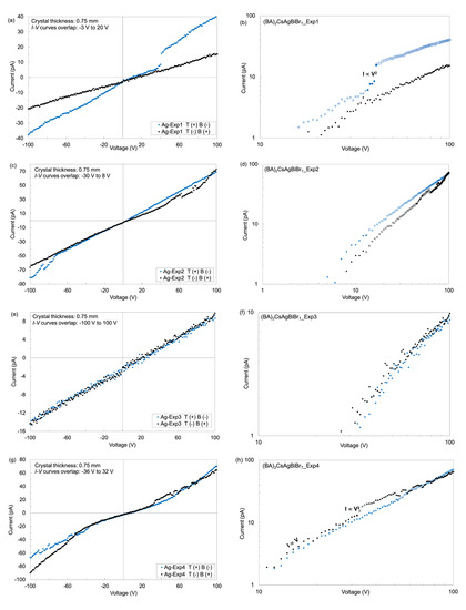 In the mid-to-high voltage range, fluctuations in the IV curves measured in both scan directions were common for all sample contacts (Figure 4). This behaviour can be attributed to drift and diffusion of charge carriers and in particular to migration of the BA+ cations and Br– anions and their accumulation at an anode and cathode (saturation current). Similar to the vacancy point defects in single crystals of Cs2AgBiBr6 [7], the VBr and VBA have lower diffusion barriers and shorter migration distances compared to the VCs, VAg and VBi. Other explanations include the surface conductivity effect of the two opposite crystal faces characterised by different growth features and defects (dislocations, twin planes, cracks, inclusions and precipitates). The mismatch in the maxima values of the measured IV curves also reflects the nature of the samples, which is described above. However, a possibility of formation of an injection barrier associated with degradation of the double perovskite material in the vicinity of the Ag electrode [23] at the bias voltages approaching 100 V cannot be excluded.